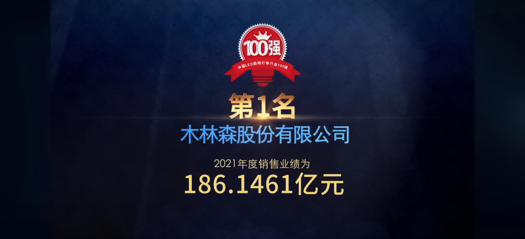 8月1日,大照明产业研究院发布“中国LED照明灯饰行业100强”榜单(简称“百强榜”),木林森凭借2021年1861461万销售业绩,其中内销业绩802525万、外销业绩1058936万的出色业绩情况,位居“百强榜”榜首,从2018年伊始至2021年,木林森已连续四年稳居“百强榜”榜首。