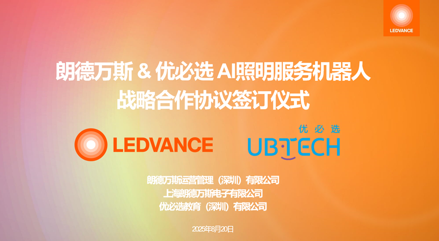2025年8月20日,木林森股份旗下朗德万斯照明与优必选教育(深圳)有限公司正式签署战略合作协议,朗德万斯全球研发总监陈华明、朗德万斯中国区CEO张鹏与优必选教育研发负责人杨壮共同出席签约仪式。此次双方宣布将在AI照明机器人领域展开深度合作,旨在整合优势资源,共同推动AI照明机器人技术的创新与应用,为全球用户带来更加智能、便捷的照明解决方案。